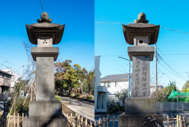 二の鳥居前の岩槻新道交差点近くに建つ一対の石燈籠は嘉永6年(1853)に建てられております。左手の石燈籠正面には大宮宿本陣の山崎喜左ェ門の名が見えますが、地元大宮に限らず周辺の村々や江戸の町の地名まで見る事が出来、広範囲の人々によって寄進された事がわかります。また、この石燈籠には、基礎の四脚の間から眉毛の垂れ下がった特徴ある獅子が顔を覗かせており、四方に顔を覗かせた二基の石燈籠である事から、「八方睨みの獅子」と言われております。