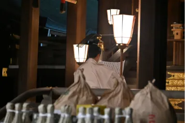 解斎のお祭で本殿祭の後、勅使館では饗膳式(きょうぜんしき)という古式床しい直会の儀が執り行われ「幾久(いくひさ)、幾久、幾久」と社頭隆盛の言祝ぎを発し、神酒を拝戴致します。