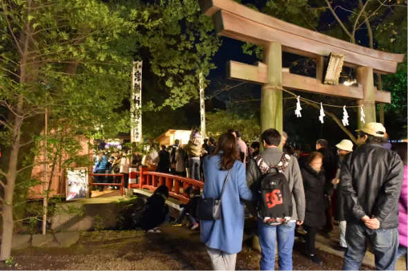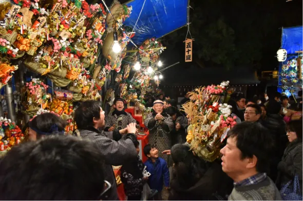 この日は特別に御祭神の大己貴命(大国様)と少彦名命(恵毘須様)の御影(福神札)や福熊手、福財布、福種銭を授与しており、授与所が建つ境内の宗像神社は大いに賑います。10日の本祭にあわせて酉の市がたつ為、十日市(とおかまち)ともいい、境内や参道に熊手や神棚(宮型)、様々な露店など約350軒が立ち並び、大いに賑い手締めの声と拍手の音が響き渡ります。