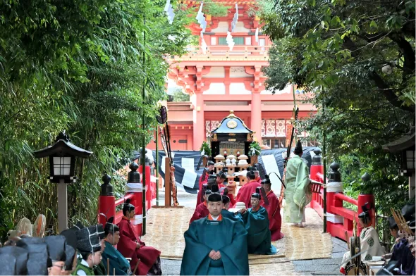 奉仕する神職、雅楽を奏する伶人、神楽を奏する神楽師、威儀物や神輿を担ぐ與丁など100名を超える人数で、