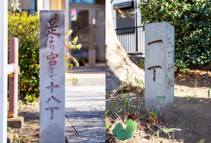 明治21年に新しい岩槻道(新道)が開削されると大宮駅方面との連絡が良くなり、旧道と新道の間に燈籠や社号標が配置されました。