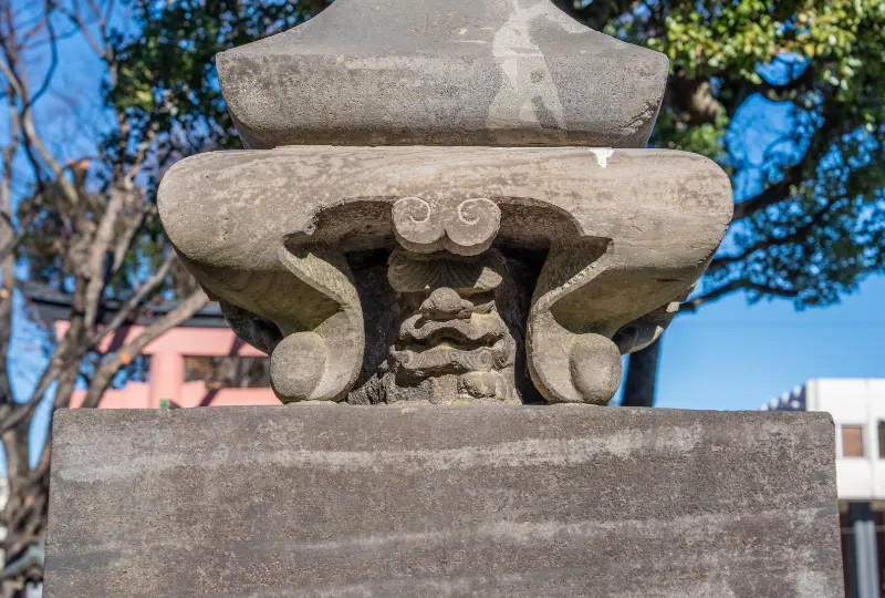 二の鳥居前の岩槻新道交差点近くに建つ一対の石燈籠は嘉永6年(1853)に建てられております。左手の石燈籠正面には大宮宿本陣の山崎喜左ェ門の名が見えますが、地元大宮に限らず周辺の村々や江戸の町の地名まで見る事が出来、広範囲の人々によって寄進された事がわかります。また、この石燈籠には、基礎の四脚の間から眉毛の垂れ下がった特徴ある獅子が顔を覗かせており、四方に顔を覗かせた二基の石燈籠である事から、「八方睨みの獅子」と言われております。